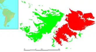 Der südliche Teil, die Halbinsel Lafonia, ist vom nördlichen Teil durch den Choiseul Sound im Wesentlichen getrennt und nur durch eine schmale Landenge bei Goose Green mit dem nördlichen Teil verbunden.