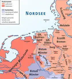 Der Augsburger Religionsfrieden von 1555 bestimmte, dass der Landesherr die Religion der Einwohner wählen durfte. Die ostfriesischen Landesherren waren zu schwach, diese Bestimmung durchzusetzen. So bestand weiterhin ein calvinistischer Westen und ein lutherischer Osten. Die Emder Konkordate von 1599 besiegelten schließlich das Nebeneinander der Konfessionen. Beim Reichsdeputationshauptschluss 1803 war Ostfriesland das einzige Reichsland neben dem Hochstift Osnabrück, in dem zwei Konfessionen zugelassen waren.[2] Katholische Kirchen gab es in Ostfriesland nicht mehr, katholische Christen kaum noch.[3]