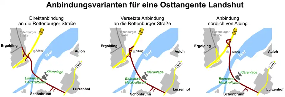 Im Stand September 2015 gültigen Flächennutzungsplan der Stadt Landshut vom 13. August 2012 sind zwei Varianten der Trassenführung einer Osttangente auf Landshuter Stadtgebiet dargestellt. Beide starten an der LA 14 und führen entlang des Bildungscampus am Lurzenhof bis zur Isar. Eine Variante wird dabei südlich des Biomasseheizkraftwerks (frühere Müllverbrennungsanlage) geführt und quert die Isar in Höhe des Bestandsknotens an der B 15 mit der Rottenburger Straße. Die Andere führt zwischen Biomasseheizkraftwerk und Kläranlage hindurch mit Brückenschlag in Höhe von Albing.[25]