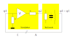 Rückgekoppelte Oszillatoren bestehen aus einem Verstärker und einem passiven, frequenzabhängigen Netzwerk. Der Verstärkerausgang speist den Eingang des Netzwerks. Der Ausgang des Netzwerks ist mit dem Verstärkereingang verbunden (Rückkopplung). Man kann in Gedanken die Rückkopplungsleitung auftrennen und erhält so an Stelle des geschlossenen Kreises eine Übertragungskette mit Eingang (E) und Ausgang (A). Für gleiche Verhältnisse wie beim geschlossenen Kreis muss die Phasenlage der Ausgangsschwingung (φ3) mit der Phasenlage der Eingangsschwingung (φ1) übereinstimmen (Phasenbedingung).