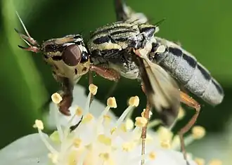 Die Fliegen erreichen eine Körperlänge von 5 bis 10 Millimetern. Der Thorax ist dicht grau bestäubt, das Mesonotum trägt zwei feine, braune Längsstreifen. Der Hinterleib ist ebenso grau bestäubt. Ihr Kopf ist gelb und ist überall, außer auf der Mitte der Stirn und am Untergesicht dicht weißlich bestäubt. Die Mitte der Stirn ist mit bräunlich gefärbten Streifen flankiert. Am oberen Teil der Backen befinden sich weitere braune Streifen, vom Augenrand bis zum Unterrand der Wangen. Sowohl die Schwingkölbchen (Halteren) als auch die Beine sind gelb gefärbt. Auf den Flügeln befinden sich am Vorderrand drei dunkle Flecken, der Apikalsaum ist ebenso dunkel. Nahe dem Flügelhinterrand sind die Flügeladern dunkel gefärbt.