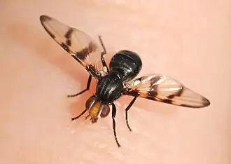 Die Fliegen erreichen eine Körperlänge von 5 bis 6 Millimetern.[1] Ihr Körper ist schwarz gefärbt. Das Mesonotum trägt drei grau bestäubte Längsstreifen.[1] Die Frons sowie die Fühler sind rotgelb gefärbt. Die Schwingkölbchen (Halteren) sind weiß. Die Beine sind schwarz. Die Flügel weisen eine charakteristische bräunliche Dunkelfärbung auf. Diese umfasst zwei Querbinden, einen Basalfleck an der Flügelvorderkante sowie einen verdunkelten Rand entlang der Flügelspitze.