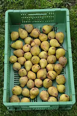 Die Frucht ist mittelgross, birnenförmig, etwas kantig und hat einen Fleischwulst am Stiel. Der Stiel ist lang, dünn, aufsitzend und geht fleischig in die Frucht über. Der Kelch ist gross und offen, die Kelchgrube weit und flach. Das Fleisch ist gelblich, fest, grob, steinig, saftig, sehr süss, leicht säuerlich und herb. Bei ungünstiger Witterung reifen die Früchte kaum aus.