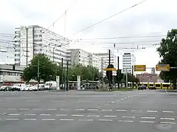 | Blickrichtung Südwest von der Kreuzung Otto-Braun-Straße/Mollstraße: links im Hintergrund das Haus der Statistik, das Haus des Lehrers, das Einkaufszentrum Alexa und das Alte Stadthaus | |