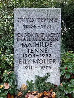 Auf dem Ohlsdorfer Friedhof in Hamburg befindet sich bei Planquadrat Y 15 nördlich vom Nordteich das Grab von Otto Tenne.[1] Die Grabinschrift ist plattdeutsch und heißt übersetzt: „Ich suche das Licht in all meinem Tun“.