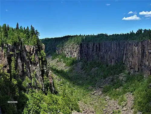 Der Ouimet Canyon Provincial Park ist ein „Nature Reserve Class Park“ im Norden der kanadischen Provinz Ontario. Der Ouimet Canyon, nach dem der 7,77 km² große Park benannt ist, und der den Kern des Parks darstellt, ist eine Schlucht bei Dorion, einem Township im Thunder Bay District. Die rund eine Milliarde Jahre zurückreichende Schlucht,[1] die von den Schmelzwässern gegen Ende der letzten Kaltzeit tief eingeschnitten wurde,[2] ist etwa 100 m tief und 150 breit, erstreckt sich dabei über etwa zwei Kilometer. Ihre Gestalt entstand bereits während der letzten Kaltzeiten, als die Schlucht noch unter Gletschern lag. Tatsächlich finden sich ähnliche Spuren, die sich über 70 km weiter nordwärts feststellen lassen, wie etwa am Cavern Lake, am Wolf Lake und bis hinauf zum Nipigonsee. Die Erosion der Felswände sorgt dafür, dass die Schlucht selbst stark von Geröll angefüllt wurde; wie tief der eigentliche Grund des von Gletscherwasser geformten Tunnels unter dem Eis war, ist unklar.[3]