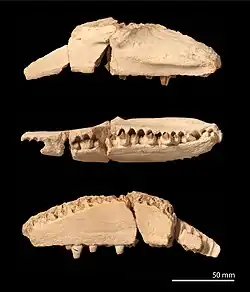 Die Schliefer, eine in ihrer Vergangenheit extrem variable, heute aber auf einige wenige murmeltierartige Formen zusammengeschrumpfte Gruppe der Paenungulata, sind mit einem einzigen Mahlzahn dokumentiert, der eventuell der urtümlichen Gattung Seggeurius entspricht. Mit einer Altersdatierung in den Beginn des mittleren Abschnitts der Paläogens stellt er den Erstnachweis der Schliefer dar.[7] Gleiches ist für die Rüsseltiere zutreffend. Sie kommen mit mehreren Formen vor. Als die ursprünglichste wird Eritherium aus dem älteren Paläogen angesehen, von dem ein Teilschädel und einzelne Unterkieferfragmente zu Tage kamen. Abweichend von allen späteren Rüsseltieren wies der Unterkiefer noch die vollständige Bezahnung der Höheren Säugetiere auf.[121][122] Das etwas jüngere und durch die beginnende Reduktion der vorderen Zähne auch modernere Phosphatherium war die erste im Ouled-Abdoun-Becken nachgewiesene Säugetierform.[123][124][125] Seit dem Erstfund eines Schädels sind mehrere weitere Exemplare hinzugekommen.[126] Der jüngste Vertreter der Rüsseltiere im Ouled-Abdoun-Becken wird Daouitherium zugewiesen und lässt sich in das mittlere Paläogen einstufen. Es liegen verschiedene Unterkieferreste vor.[127] Alle Rüsseltiere des Ouled-Abdoun-Beckens waren im Vergleich zu den heutigen Elefanten sehr klein. Für Eritherium ist ein Körpergewicht von 3 bis 8 kg rekonstruierbar, Phosphatherium war dem gegenüber schon fast doppelt so schwer. Die starke Körpergrößenzunahme der Rüsseltiere zeichnet sich schon bei Daouitherium ab, das 80 bis 170 kg auf die Waage brachte. Sie besitzen weitgehend Zähne mit niedrigen Zahnkronen und ernährten sich daher wohl von weicher Pflanzenkost. Bei keiner Form waren, soweit es das Fundmaterial aussagen lässt, Rüssel oder Stoßzähne ausgebildet. Mit den Rüsseltieren nahe verwandt sind die ausgestorbenen Embrithopoda, deren Charakterform Arsinoitherium aus dem Unteren Oligozän des Fayyum in Ägypten riesige Körpermaße ausbildete und durch knöcherne Hörner auf dem Schädel charakterisiert ist. Im Ouled-Abdoun-Becken kommt mit Stylolophus, belegt über mehrere zerquetschte Schädel, ein früher Vorfahre vor, der zwischen 30 und 80 kg wog und somit deutlich kleiner war. Auch bezüglich der Zähne zeigt er sich ursprünglicher, da diese noch nicht so extrem hochkronig sind.[35]