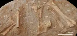 Alle bisher aus dem Ouled-Abdoun-Becken vorgestellten Vögel datieren in das Paläogen und stehen innerhalb der Neukiefervögel, es handelt sich um die derzeit ältesten Belege aus Afrika. Hierzu zählt unter anderem Dasornis aus der ausgestorbenen Gruppe der Pelagornithidae. Diese großen Seevögel mit gezackten Schnabelrändern, was an Zähne erinnert und ihnen auch die Bezeichnung als „Pseudozahnvögel“ einbrachte, wurden ursprünglich als den Pelikanen nahestehend angesehen, gehören aber mittlerweile einer eigenständigen Gruppe an. Dasornis ist im Ouled-Abdoun-Becken mit wenigstens drei Arten überliefert, deren Flügelspannweite zwischen 1,5 und 4,5 m variierte. Das aufgefundene Material ist recht umfangreich, aber insgesamt sehr stark fragmentiert, was der Natur des fragilen Skelettbaus entspricht. Im Gegensatz zu anderen Angehörigen der Gruppe war Dasornis eventuell kein so stark spezialisierter Gleitflieger und aufgrund der längeren Hinterbeine auch an Land agiler.[112] Zwei weitere Vogelvertreter reihen sich in das engere Umfeld der Tropikvögel ein. Bei der einen handelt es sich um Lithoptila, eine Form, die ursprünglich basierend auf einem Hirnschädel aufgestellt wurde. Nachfolgend kamen auch zahlreiche Gliedmaßenknochen zum Vorschein, die das Tier als einen geschickten Flieger mit schlanken Flügeln auszeichnen, deren Spitzen gespreizt etwa 1 m auseinanderstanden.[113][114] Die zweite Form wird durch Phaetusavis repräsentiert, von der aber lediglich ein Oberarmknochen zu Tage gefördert wurde. In den Körperausmaßen entsprach sie weitgehend Lithoptila, allerdings war bei Phaetusavis das obere Gelenkende massiver gestaltet.[115][34]