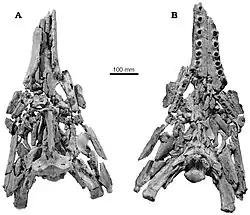 - ↑ Stéphane Jouve: A new description of the skull of Dyrosaurus phosphaticus (Thomas, 1893) (Mesoeucrocodylia: Dyrosauridae) from the Lower Eocene of North Africa. Canadian Journal of Earth Science 42, 2005, S. 323–337, doi:10.1139/E05-008