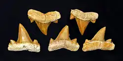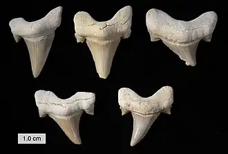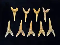 Den weitaus größten Anteil aller Fossilfunde haben die Knorpelfische mit den Hai- und Rochenartigen. Deren Fundmaterial beschränkt sich aber naturgegebenermaßen auf Zähne und vereinzelt Wirbel. Unter den Haien sind wenigstens acht größere Linien nachweisbar. Hierzu gehören ursprüngliche Gruppen wie die Grauhaiartigen, die Nagelhaie, die Sägehaiartigen, die Dornhaiartigen und die Engelhaiartigen, die allesamt zu den Squalomorphii zusammengefasst werden. Bis auf die Nagelhaie, die im Ouled-Abdoun-Becken bisher nur aus dem Paläogen nachgewiesen sind, kommen alle anderen Formen auch im Maastrichtium vor. Zu den Nagelhaien zählt unter anderem Heptranchias. Die Gattung schließt heute noch den Spitzkopf-Siebenkiemerhai ein, welcher den Meeresgrund bewohnt. Fossil ist sie über etwa 1,2 cm lange Zähne belegt, die typischerweise eine Hauptspitze und mehrere in Reihe angeordneter kleinerer Nebenspitzen aufweisen.[42] Die Stierkopfhaiartigen, die Ammenhaiartigen, die Makrelenhaiartigen und die Grundhaiartigen fassen die moderneren Haie der Galeomorphii zusammen. Von diesen sind aber nur die letzten drei sehr häufig fossil im Ouled-Abdoun-Becken anzutreffen. Allein 14 Gattungen stellen die Ammenhaiartigen. Palaeorhincodon kam dabei aus den Paläogen-Schichten zu Tage. Er wird als eine Vorgängerform des Walhais angesehen, dem größten Fisch der Gegenwart und heute einziges Mitglied der Rhincodontidae. Funde sind aber eher selten, bisher wurden etwas mehr als 40 Zähne entdeckt. Diese sind an der Hauptspitze bis zu 4 mm hoch. Die Hauptspitze wiederum ist stark nach hinten oder zur Seite gekrümmt, seitlich flankiert sie je eine kleinere Spitze.[43] Wesentlich häufiger treten die Ammenhaie selbst auf, unter anderem mit Ginglymostoma.[44] Andere Formen verweisen auf die Bambushaie, die Blindhaie beziehungsweise auf die Teppichhaie. Bei letzteren wurde Squatiscyllium rund 1,5 m lang und war damit etwa halb so groß wie heutige Formen. Seine Reste datieren in das Paläozän. Fast doppelt so große Ausmaße erreichten die Sandhaie, die im Paläozän eine hohe Diversität entfalteten, unter anderem mit der Gattung Odontaspis. Carcharias wurde ursprünglich ebenfalls in die Gruppe gestellt, zählt aber heute zu den Sandtigerhaien. Die Gattung ist nur im Maastrichtium dokumentiert. Sowohl die Sandhaie als auch die Sandtigerhaie stehen innerhalb der Makrelenhaiartigen, die mit insgesamt fast zwei Dutzend Gattungen die umfangreichste Gruppe der Haie im Ouled-Abdoun-Becken darstellen. Sie schließen mit den Koboldhaien und den ausgestorbenen Otodontidae die größten räuberischen Fische ein. So erreichte wohl der im Maastrichtium auftretende Koboldhai Scapanorhynchus aufgrund seiner rund 7 cm hohen vorderen Zähne eine Länge von rund 5 m. Vergleichbare Körperausmaße werden für den Otodontidae-Vertreter Otodus aus dem Paläogen angenommen. Ebenfalls überlieferte Wirbel besitzen mitunter über 10 cm Durchmesser. Sie bestehen aus ringförmigen Schichten, die laut Isotopenuntersuchungen jährliche Wachstumsraten angeben, wodurch ein Individuum zur Zeit seines Todes auf rund 19 Jahre bestimmt werden konnte.[45] Die Gattung enthält auch den deutlich jüngeren und riesigen Megalodon. Darüber hinaus sind die Fuchshaie präsent, dessen weniger als 1 cm langen Zähne seitlich neben der Hauptspitze mit zusätzlichen kleinen, niedrigen Spitzen ausgestattet waren.[42] Als sehr häufig erwiesen sich die ausgestorbenen Anacoracidae. Hier ist Squalicorax hervorzuheben, ein 3 bis 4 m langes Tier, dessen seitlich gepressten und am Rand fein gezackten Zähne etwas denen des nicht näher verwandten Tigerhais ähneln und auf einen effektiven Räuber deuten lassen. Vermutlich ernährte er sich von Schildkröten. Die mehrere Arten einschließende Gattung ist auf das Maastrichtium beschränkt.[46] Gleiches gilt für die ebenfalls nicht mehr bestehenden Cretoxyrhinidae mit Cretolamna. In der Größe Squalicorax ähnelnd, finden sich dessen Zähne häufig in Resten von Meeresreptilien, so dass diese Form wohl aasfressend war. Eine weitere erloschene Gruppe sind die Serratolamnidae, deren Typusform Serratolamna wiederum aus dem Maastrichtium vorliegt. Zum Schluss seien noch die Grundhaiartigen erwähnt, die hauptsächlich im Paläogen sehr häufig auftreten. Von ihnen sind fast genauso viele Gattungen wie bei den Makrelenhaiartigen dokumentiert. Zwei Charakterformen bilden hier Abdounia und Physogaleus aus der Gruppe der Requiemhaie. Äußerst divers erscheinen die Katzenhaie, die allerdings meist weniger als 2 m lang wurden. Belegt sind unter anderem Pteroscyllium, Scyliorhinus und Premontreia. Andere Formen wie Palaeogaleus und Triakis verweisen auf das Vorkommen der Glatthaie.[1][43][34]