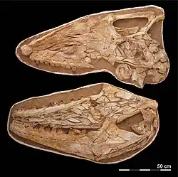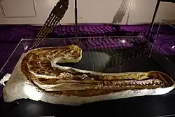 Die umfangreichste und vielfältigste Gruppe der Schuppenkriechtiere bilden jedoch die Mosasaurier, teils riesige Tiere mit aalartig verlängertem Warankörper und großem Schädel. Alle im Ouled-Abdoun-Becken aufgefundenen Mosasaurier gehören der jüngsten Entwicklungslinie an und waren vollständig an das Wasserleben angepasst. Ihre Kennzeichen sind ausgebildete Flossen mit überzähligen Gliedern und ein Becken, das nicht mit der Wirbelsäule verbunden war. Mit 3 bis 4 m Gesamtlänge einen der kleinsten und zudem den urtümlichsten Vertreter repräsentiert Halisaurus. Wie bei den stammesgeschichtlich jüngeren Mosasauriern nahm die Wirbelsäule im Schwanzbereich einen nach unten gekrümmten Verlauf an. Eine dort ausgebildete halbmondartige Schwanzflosse diente dabei als Antrieb im Wasser, wodurch die Tiere bereits reine Meeresbewohner darstellen. Von Halisaurus sind mehrere Teilskelette und Schädel dokumentiert. Das Gebiss setzt sich aus schlanken, nadelspitzen und nach hinten gekrümmten Zähnen zusammen.[62][63] In enger Beziehung zu Halisaurus steht Pluridens, von dem mehrere Schädel mit assoziierten Unterkiefern bekannt sind. An der langen Schnauze waren mehrere Öffnungen für Nervenbahnen ausgebildet. In Verbindung mit den deutlich kleinen Augenfenstern orientierten sich die 5 bis 6 m langen Tiere wohl eher tastend und riechend im Wasser, vergleichbar heutigen wasserlebenden Schlangen. Die zahlreichen kleinen und spitzen Zähne implizieren eher kleine Beute als Fang.[64] Einer anderen Verwandtschaftsgruppe innerhalb der Mosasaurier gehört der rund 6 m lange Gavialimimus an, dem Schädel und Skelettteile sowie zahlreiche Einzelzähne zugeordnet werden. Der 90 cm messende Schädel wies eine extrem ausgedehnte Schnauze auf, die gut zwei Drittel der Gesamtlänge ausmachte. Dies erinnert stark an die Gaviale, worauf auch der Gattungsname hinweist.[65] Enger verwandt ist Khinjaria, ein gut 8 m langes Tier, das mit seinen extrem langen, dolchartigen Zähnen wohl an große Beutefische angepasst war. Aufgefunden wurde bisher ein fragmentierter Teilschädel.[66] Eine vergleichbare Körpergröße besaß Hainosaurus, von dem das vordere Gebiss vorliegt. Dieses war heterodont aufgebaut und bestand aus seitlich verschmälerten und dadurch klingenartig spitz wirkenden Zähnen.[67][68]
