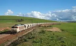 Die Phosphatvorkommen Marokkos gelten mit schätzungsweise 51 Milliarden Tonnen an Phosphoriten als die weltweit reichsten Rohstoffquellen dieser Art, sie repräsentieren nach einigen Angaben etwa drei Viertel der Weltressourcen.[24] Die Zahlen werden teils kritisch gesehen, allerdings sind sowohl das Ouled-Abdoun-Becken als auch die weiteren Phosphatlagerstätten Marokkos bisher nicht vollständig erkundet.[25][5][26] Jährlich werden in dem Land rund 19 Millionen Tonnen an Phosphaten gefördert, von denen zwischen 13 und 15 Millionen Tonnen in den weltweiten Handel gelangen. Ein großer Anteil davon stammt aus dem Ouled-Abdoun-Becken, dessen Reserven noch Mitte der 1990er Jahre auf rund 28 Milliarden Tonnen an Phosphoriten beziffert wurden.[4] Im Ouled-Abdoun-Becken sind mehr als ein Dutzend Lagerstätten erkundet, die wichtigsten davon finden sich mit Mrzig, Khouribga und Grand Daoui im nördlichen, mit Meraâ El Arech und Ouled Farès im zentralen sowie mit El Borouj, El Halassa und Sidi Chennane im südlichen Abschnitt.[9] Der Großteil des Abbaus der Phosphorite erfolgt auf Grund der harten Deckschichten unter Tage. Lediglich im Norden des Ouled-Abdoun-Beckens, wo die auflagernden Kalksteine teils stärker verwittert sind, ist seit der Mitte des 20. Jahrhunderts auch ein Tagebaubetrieb verbreitet. Er wurde zusätzlich begünstigt durch die Entwicklung großer Abraummaschinen wie unter anderem der Schürfkübelbagger „Marion 7900“, der bei seinem Dienstantritt 1960 im Grand Daoui-Abbaugebiet mit einem Gewicht von 1870 t, einem Kranausleger von 84 m Länge, einem Aktionsradius von 59 m und einem Schaufelvolumen von 39 m³ der größte seiner Art war.[22][27][4] Teilweise erschwert werden die Arbeiten durch sterile Abschnitte aus silikatischem Kalkstein, die aus dem Hangenden in die Phosphatlager eindringen und zwischen 10 und 150 m im Durchmesser aufweisen. Möglicherweise gehen sie auf die Evaporitlage am oberen Abschluss der Campanium-Folge zurück, die durch Karstverwitterung Hohlräume ausbildete. Diese brachen folgend zusammen, was zum Nachrutschen der auflagernden Sedimente führte.[28][29][26][8]