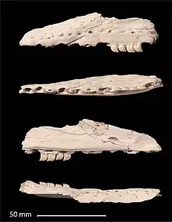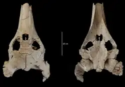Neben diesen ausgestorbenen Linien sind auch Reste von Angehörigen heute noch bestehender Gruppen entdeckt worden. Hierbei handelt es sich weitgehend um den Verwandtschaftskreis der Gaviale. Diese ebenfalls langschnauzigen Krokodile, weisen zuzüglich einiger anderer Merkmale aber Unterschiede im Aufbau des Gaumens auf. Hervorzuheben ist auch ihr im Vergleich mit anderen modernen Krokodilen weitgehend homodontes Gebiss aus gleich großen Zähnen. Die frühesten Gaviale sind im Ouled-Abdoun-Becken mit Ocepesuchus bereits im Maastrichtium präsent, dessen Belegmaterial aus einem stark zerquetschten Schädel besteht. Es ist damit einer der ältesten Fossilnachweise moderner Krokodile in Afrika. Es wird angenommen, dass die Tiere eventuell teilweise oder vollständig auf Flüsse beschränkt waren, da in den Meeren zu dieser Zeit andere Reptilien dominierten.[103] Weitere Gaviale traten dann erst im Paläogen auf. Aufgefundene Formen werden zu Agrochampsa und Thoracosaurus geordnet. Von beiden ist erstere mit wenigstens vier Schädeln überliefert, das Holotyp-Exemplar misst rund 43 cm, die Schnauze davon allein 31 cm. Als auffällige Eigenschaft der Tiere knickt der vordere Teil der Schnauze deutlich nach unten ab.[104][105] Innerhalb der Gaviale können die Tomistominae abgesetzt werden, deren Bezahnung variabler ausfällt. Maroccosuchus gehört zu den ältesten Repräsentanten dieser Linie, die heute noch den Sunda-Gavial stellt. Die Ausweisung der Form basiert auf zahlreichem Schädelmaterial aus dem Ouled-Abdoun-Becken. Im Vergleich zum Sunda-Gavial ist sein Schädel aber deutlich robuster gebaut, wodurch die Schnauze insgesamt breiter wirkt.[106][34]