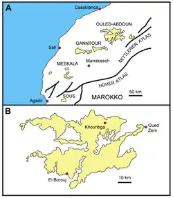 - ↑ a b N. El Assel, A. Kchikach, C. Durlet, N. AlFedy, K. El Hariri, M. Charroud, M. Jaffal, E. Jourani und M. Amaghzaz: Mise en évidence d’un Sénonien gypseux sous la série phosphatée du bassin des Ouled Abdoun: Un nouveau point de départ pour l’origine des zones dérangées dans les mines à ciel ouvert de Khouribga, Maroc. Estudios Geológicos 69 (1), 2013, S. 47–70, doi:10.3989/egeol.40781.168