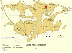Von den fünf Phosphatbecken Marokkos stellt das Ouled-Abdoun-Becken das größte dar. Es erstreckt sich über 80 km in Ost-West- sowie 60 km in Nord-Süd-Richtung und nimmt eine Fläche von rund 9000 km² ein. Im Osten begrenzt der Hohe Atlas das Becken, im Westen das Rhamna-Massiv und im Süden das Beni-Amir-Plateau. Außerdem wird es im Süden und Westen vom Oum er-Rbia umflossen. Als größere Städte befinden sich Khouribga im Norden, Oued Zem im Nordosten und El Borouj im Südwesten des Ouled-Abdoun-Beckens. Die Höhenlagen reichen von 500 m im Südwesten bis 875 m im Norden. Die überwiegend ebene Landschaft wird durch trockenes Wüstenklima bestimmt. Der stärkste Niederschlag fällt von November bis Mai, er überschreitet aber kaum 400 mm auf das Jahr verteilt. Die Vegetation ist eher spärlich. Die örtliche Bevölkerung lebt von Viehzucht und jahreszeitlich beschränkter Landwirtschaft. Sie verteilt sich auf mehrere Ortschaften. Grundwasser ist generell selten und wird aus zum Teil über 100 m tiefen Brunnen geschöpft.[1][4][5][6]
