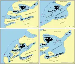 Ein weiteres Modell wurde in den 1980er Jahren von H. Salvan erarbeitet. In seiner Rekonstruktion vereinigten sich die beiden nördlichen engen Golfe zu einem breiten Epikontinentalmeer, das „Phosphatmeer“, dessen Atlantikzugang sich zwischen Casablanca und Essaouira erstreckte. Das Rhemna-Massiv bestand als Insel analog zur Ansicht von Boujo, während vom Jbilet aus eine Landverbindung nach Süden ausgebildet war. Die Existenz eines südlichen Ǵolfes bei Sous lehnte Salvan weitgehend ab, vielmehr verband sich das Sous-Becken nach Norden mit dem Meskala-Becken. Etwa im gleichen Zeitraum entwarf Hans-Georg Herbig ein ähnliches Bild, allerdings nahm er eine weitflächige Überflutung des gesamten Bereiches an. Nach Osten hin überdeckte das Meer zusätzlich das Ouarzazate-Becken und hatte damit auch das Gebiet des heutigen Hohen Atlas eingenommen. Die Existenz einzelner Inseln schloss Herbig nicht aus. Als Variation davon kann die Rekonstruktion von Jörg Trappe aus dem Beginn der 1990er Jahre angesehen werden. Hier dehnte sich die Meeresverbindung des Epikontinentalmeeres von Casablanca bis weit nach Süden nach Agadir aus.[132][12][13]
