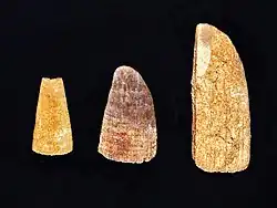 Vergleichbar den Flugsauriern finden sich landbewohnende Dinosaurier nur selten im Fossilbericht des Ouled-Abdoun-Beckens, auch hier stammen die ersten Funde aus dem Beginn der 2000er Jahre. Zu den wenigen Hinweisen gehört ein Hinterbein eines kleinen Sauropoden, das aber bisher keiner bestimmten Form zugewiesen werden konnte. Möglicherweise ist sie innerhalb dieser teils riesigen, vierfüßigen und langhalsigen Pflanzenfresser als ein basaler Vertreter der Titanosauria eingrenzbar.[108] Darüber hinaus zeigen ein vorderes, hoch gestaltetes Unterkieferfragment und mehrere Einzelzähne das Auftreten der Theropoda an, zweibeinig laufenden Fleischfressern. Die Zähne, von denen allein zehn noch im Unterkiefer stecken, sind dreieckig-spitz geformt und mit scharfen, fein gezackten Seitenkanten ausgestattet. Die Reste wurden als zu Chenanisaurus gehörig beschrieben, einem rund 7 bis 8 m langen Vertreter der Abelisauridae.[109][30] Mit Ajnabia ließ sich auch der erste Vertreter der Hadrosauridae aus Afrika belegen. Diese durch ihre entenschnabelartige Schnauzenstruktur charakterisierte Gruppe ist sonst nur von den nördlichen Festlandsmassen von Laurasia bekannt. Ihr Auftreten im Ouled-Abdoun-Becken und somit im nördlichen Gondwana setzt eine Einwanderung über die Tethys voraus, weswegen die neue afrikanische Form auch mit dem Artepitheton odysseus nach dem gleichnamigen Held der griechischen Mythologie bedacht wurde. Bisher kam ein rund 16 cm langes Oberkieferfragment zu Tage, das rund 23 Zahnfächer besitzt und auf ein etwa 3 m langes Tier schließen lässt.[110] Die nahe verwandte Form Minqaria wurde mit einer Länge von 3,5 m ähnlich groß. Sie besaß einen extrem stark aufgewölbten Schädel. Aufgefunden wurden Kieferfragmente, die auf wenigstens 25 Zähne in Reihe schließen lassen, und Schädelreste. Einige Gliedmaßenknochen aus dem Ouled-Abdoun-Becken sprechen dafür, dass noch andere Hadrosaurier die Landschaft bewohnten, möglicherweise aber doppelt so groß waren wie Ajnabia und Minqaria.[111][34]