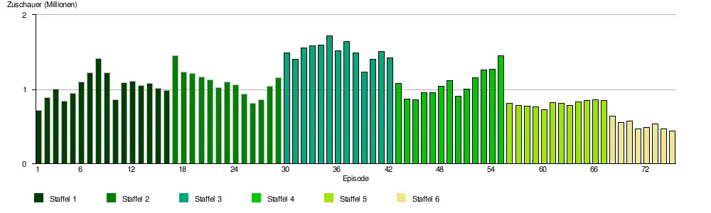 | Staffel 3 | 1,493 | 1,401 | 1,553 | 1,588 | 1,597 | 1,716 | 1,52 | 1,639 | 1,492 | 1,234 | 1,402 | 1,509 | 1,427 | N/A | |||