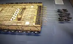 Das zu verarbeitende Material der Zimmerleute, die in der Zunft der „holtzsnijdere“, Holzschneider, Brettschneider und -säger vereinigt waren, lieferten auswärtige Händler. Diese ließen durch Flößer die georderten Mengen auf dem Rhein nach Köln transportieren. Im Schwarzwald geschlagenes Holz wurde dann von Straßburg rheinabwärts bis Köln geflößt und am Holzmarkt gestapelt. Diese Transporte bestanden aus grob bearbeiteten, miteinander zu riesigen Plateaus verbundenen Baumstämmen, deren Flöße eine immense Länge erreichten. Die so zusammengestellten Kontingente bestanden aus über 1500 Stämmen und konnten 200 bis 400 Meter Länge sowie 40 bis 80 Meter Breite erreichen. Die in Schichten arbeitende und ruhende Mannschaft hatte für den langen Transportaufenthalt auf diesen riesigen Flößen eigens aufgestellte Behelfshütten errichtet. Das überwiegend aus Ruderknechten bestehende Personal eines solchen Floßes soll eine Stärke von bis zu 300 Mann erreicht haben.[22] Durch die aufkommende Steinbauweise ließ der Bedarf an Holz nach, so dass in späterer Zeit mit dem entstehenden Ausbau des Schienen- und Straßennetzes die Flößerei gegen Ende des 19. Jahrhunderts weitgehend eingestellt wurde.
