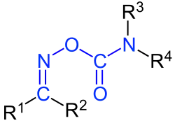 Allgemeine Struktur der Oxim-Ester von Carbamidsäuren. Dabei sind R1 bis R4 Organyl-Reste (Alkyl-Reste, Aryl-Reste, Arylalkyl-Reste etc.). Wenn R1 oder R2 ein Wasserstoffatom bedeuten, handelt es sich um einen Aldoxim-Carbamidsäureester. Die Oxim-Carbamidsäureester-Gruppe ist blau markiert. Wenn R1 und R2 verschieden sind, gibt es (E,Z)-Isomere. |