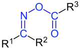 Allgemeine Struktur der Oxim-Ester von Carbonsäuren. Dabei sind R1 bis R3 Organyl-Reste (Alkyl-Reste, Aryl-Reste, Arylalkyl-Reste etc.) oder Wasserstoffatome. Wenn R1 oder R2 ein Wasserstoffatom bedeuten, handelt es sich um einen Aldoxim-Ester. Die Oxim-Ester-Gruppe ist blau markiert. Wenn R1 und R2 verschieden sind, gibt es (E,Z)-Isomere. |