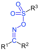 Allgemeine Struktur der Oxim-Ester von Sulfonsäuren. Dabei sind R1 bis R3 Organyl-Reste (Alkyl-Reste, Aryl-Reste, Arylalkyl-Reste etc.). Wenn R1 oder R2 ein Wasserstoffatom bedeuten, handelt es sich um einen Aldoxim-Sulfonsäureester. Die Oxim-Sulfonester-Gruppe ist blau markiert. Wenn R1 und R2 verschieden sind, gibt es (E,Z)-Isomere. |
