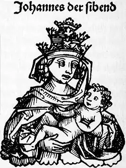 Die Legende um die Päpstin Johanna ist seit dem 13. Jahrhundert überliefert und erlangte im Spätmittelalter große Popularität und weite Verbreitung. Die ursprünglichen Formen der Sage berichteten von einer namenlosen Päpstin, die gegen Ende des 11. Jahrhunderts amtiert haben soll; so berichten es die Chronica universalis Mettensis des Jean de Mailly (lat. Iohannes de Malliaco[1][2]) und der Tractatus de diversis materiis predicabilibus des Stephan von Bourbon um die Mitte des 13. Jahrhunderts.