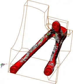 - Besonderheiten: Große Modelle, extreme Rechenleistung durch spezielle Algorithmen (z. B. für Kontaktanalyse), Vektorisierung, Parallelisierung und GPU Nutzung (auch simultan). Ein Modell für alle Anwendungsgebiete, detaillierte Modellprüfung und hohe Genauigkeit. Integrierte, vielfältige Optimierungsmethoden (Topologie-, Form-, Dimensionierung und deren Kombination), Zuverlässigkeitsanalyse (robust design) und Sampling (DOE)[8], Generatives Design