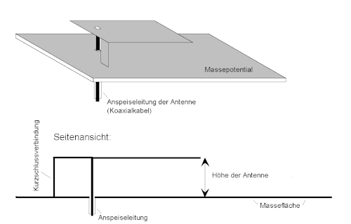 Durch Hinzufügen von L- oder U-förmigen Schlitzen in die obere Antennenfläche können zusätzliche Resonanzfrequenzen erreicht werden. Die aus diesen Grundelementen gebildeten Formen besitzen zwei oder mehr Anspeisepunkte, und eine gemeinsame Schirmung auf Massepotential. Durch Hinzufügen weiterer Kurzschlussverbindungen bzw. Massepunkte im Bereich der Antenne können die Resonanzfrequenzen auch durch Veränderung der elektrischen Kapazitäten angepasst werden.