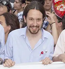 Pablo Manuel Iglesias Turrión (* 17. Oktober 1978 in Madrid) ist ein spanischer Politologe und ehemaliger linkssozialdemokratischer Politiker der Linkspartei Podemos. Als Aktivist der sozialen Protestbewegung Movimiento 15-M (Bewegung 15. Mai) von 2011/12 avancierte er zum Generalsekretär der im Frühjahr 2014 gegründeten Partei Podemos („Wir können es“) Bei den spanischen Parlamentswahlen 2019 wurde Podemos in einem Wahlbündnis mit dem kommunistisch dominierten Parteienbündnis Izquierda Unida unter dem Namen Unidas Podemos viertstärkste Fraktion und bildete eine Regierungskoalition mit der gemäßigt sozialdemokratischen PSOE.[1] Iglesias war von Januar 2020 bis März 2021 einer der vier Vize-Ministerpräsidenten sowie Minister für die Agenda 2030 und Soziale Rechte der spanischen Regierung.[2] Seitdem arbeitet er als Publizist und Journalist bei Canal RED und Diario Red.