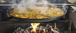 Traditionell wird die Paella auf einem offenen Pinien- oder Mandelholzfeuer im Freien zubereitet, oft in großen Mengen für die ganze Familie. Die Paella-Pfanne ruht dabei auf einem eisernen Dreifuß, dem tripote, der im Feuer steht. Diese Tradition erfreut sich in der Region Valencia großer Beliebtheit. Traditionell wird die Paella direkt aus der Pfanne mit dem Löffel gegessen; heute werden meist Teller dazu gereicht, auf die sich die Esser aus der Pfanne auftun. Normalerweise dient die Paella als Mittagessen, das gegen 15 Uhr eingenommen wird, nicht jedoch abends, da sie dafür vielen als zu üppig gilt.
