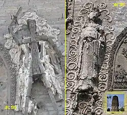 Besonders im Nordwesten von China, wo trockenes Klima und starke Winde gepaart mit Wüstenbildung und Sandmigration vorherrschen, kann die Erosion erhebliche Zerstörung verursachen. Nicht nur die Reliefs und die hervortretenden Stellen können dadurch zerstört werden; einige der Pagoden sind bereits so stark abgeschliffen, dass sie einem Haufen Backsteine gleichen.