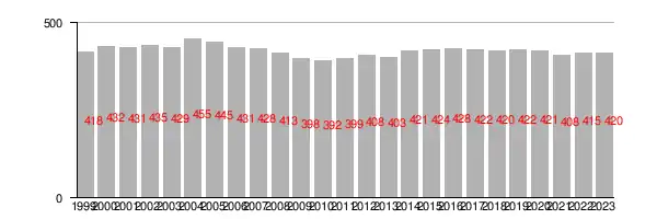 Entwicklung der Einwohnerzahl der vergangenen 20 Jahre (Stand jeweils 31. Dezember):