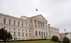 Der Palácio de São Bento ist seit 1834 Sitz des portugiesischen Parlaments (Assembleia da República).[1] Man gelangt über eine breite Außentreppe hinauf zum Palast. Die 1941 errichtete Treppe ist beidseitig flankiert von marmornen Löwen. Am Haupteingang unterhalb der neoklassizistischen Säulenfront befinden sich vier weibliche allegorische Statuen, welche die Tugenden Mäßigung, Gerechtigkeit, Stärke und Vernunft symbolisieren. Der sechs Meter hohe und 30 Meter lange Giebel über dem Vorbau wurde vom Bildhauer Simões de Almeida verziert.
