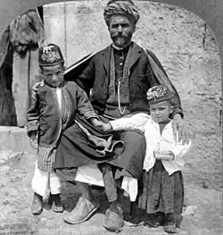 Unter beiden Kopfbedeckungen trug man anders als unter dem Istanbuler Tarbusch[18] eine Takiye genannte Schweißkappe.[19] Diese Takiye trugen bereits Kleinkinder; etwa im Alter von fünf oder sechs Jahren begann man, den Tarbusch zu tragen, und erst Erwachsene trugen auch den Turban.[20] Mindestens die Takiye bedeckte stets das Haupt.[21] Barhäuptigkeit galt als Schande, und einem anderen das Haupt zu entblößen, war ein gerichtswürdiges Vergehen.[22]