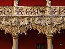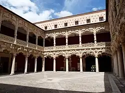 Die nach Westen gelegene Hauptfassade gilt als ein Juwel des isabellinischen Stils. Die auffälligsten Dekorationselemente sind die Diamantspitzen, die über die gesamte Fassade verteilt sind. Im obersten Stockwerk, das die Fassade bekrönt, befindet sich über einem Fries mit muqarnas-Dekor eine Galerie, die von Wachtürmchen akzentuiert wird, das Ganze mit feinstem Mudéjardekor versehen. Hinter der Galerie befand sich früher der Lesesaal der Provinzbibliothek, der mit großer Nüchternheit in einem klassizistischen Stil gehalten ist, bekrönt von einer Kassettendecke. Laut Ruiz Sousa reflektiert die Sprache der Fassade andalusische Einflüsse auf die Schule von Toledo, mit dem Ziel, ein Modell für den modus vivendi des Adels zu schaffen.[1] Egas Cueman entwarf die aufwendige skulpturale Ausstattung des Palastes.