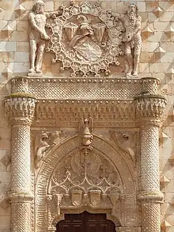 Der Haupteingang zum Gebäude befindet sich an der linken Seite der Hauptfassade und führt direkt zum Innenhof, dem Patio. Das Portal wird von zwei dicken zylindrischen Säulen flankiert, die verziert sind mit zwei ineinander verschlungenen Kragen aus geflochtenen Kordeln. Über der Tür halten zwei Faune oder behaarte „wilde Männer“ eine runde Kette aus 20 verschiedenen Schilden, welche die Staaten, Titel und Herrschaften repräsentieren, die bis zu diesem Zeitpunkt in den Händen des Hauses Mendoza waren. In der Mitte der rahmenden Kette erscheint das Wappen der Familie Mendoza mit einer Herzogskrone darüber und verschiedenen anderen Symbolen, das Ganze bekrönt von einem greifenköpfigen Adler.