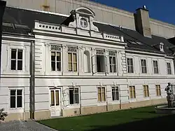 Die hofseitige Fassade des Quertraktes wird durch einen flachen Mittelrisalit gegliedert. Im Sockelgeschoß des Risalits ist eine Vorhalle mit Balustrade vorgelagert. Ein segmentbogenförmiger Dachgiebel mit dem Wappen von Habsburg-Lothringen bekrönt den Mittelrisalit. Die hohe Dachzone ist durch eine Attikabrüstung mit Putten und auf den Seitentrakten zusätzlich mit Dachgauben strukturiert. Alle Trakte sind mit einer gebänderten Sockelzone mit rechteckigen Fenstern mit Keilsteinen versehen. Die Fenster in der Beletage haben eine gerade Fensterverdachung, ausgenommen das Fenster in der Mittelachse mit einer segmentbogenförmigen Verdachung, geschichtete Sturzfelder und einfachen Dekor in den Parapeten.