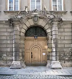 Das große Portal wird von zwei Dreiviertelsäulen im toscanischen Stil[6] gerahmt, mit seinem Rundbogen-Eingang ist es zugleich die zentrale Achse des Bauwerks in der Grünangergasse. Über der dreiflügeligen hölzernen Tür befindet sich ein schmiedeeisernes Ziergitter im Bogenfeld. Auf den Torsäulen sind halb liegende Windhunde aus Sandstein modelliert, die die Wappentiere der Freiherren von Hatzenberg symbolisieren. Sie halten in ihren Pfoten Blumengirlanden, die über den gesamten Bogen von einer Säule zur anderen reichen. Dazwischen sind noch kleine typisch barocke Voluten zu sehen, die den Schlussstein umrahmen.