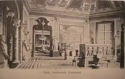 An den Wänden, auf Leinwand übertragen, befanden sich Originalfresken von Domenichino, aus dem Casino der Villa Aldobrandini in Frascati bei Rom. Sie zeigten die Taten des Apollo mit Landschaften aus der Umgebung Roms. Heute befinden sich diese Werke in der National Gallery in London. Der Plafond war nach Art der Deckenmalereien italienischer Palästen mit Grau-in-Grau Kopien nach Raphaels Planetenbildern in der Chigi-Kapelle der Kirche Santa Maria del Popolo in Rom bemalt. In der Mitte des Saales stand ein Sarkophag aus dem 3. Jahrhundert n. Chr., aus Kilikien, an der Wand rechts der Eingangstür ein Marmortisch mit einem Weiherelief aus Athen aus dem 4. Jahrhundert v. Chr. Dieser Raum enthielt mehrere Vitrinen. In einer derselben befanden sich altägyptische Altertümer und bemalte griechische Vasenfragmente, in einer anderen griechische Terracotten, in einem größeren dritten Schaukasten antike, teilweise von der Insel Aegina bei Athen stammende Bronzen, sowie ein großes Marmorvasenfragment mit Relieffiguren aus der alexandrinischen Epoche. Der hier befindliche Torso eines Fauns war eine altrömische Kopie nach römischen Original. In größeren Vitrinen waren griechischen Terracotten und griechische Vasen ausgestellt. Weitere Werke in diesem Raum waren eine römische Bacchusstatue, eine römische Grabbüste mit Inschrift, eine Herme aus hadrianischer Zeit, eine griechische, bei Rom gefundene Büste, eine kleine Büste einer römischen Matrone sowie eine griechische Büste aus dem 4. Jahrhundert v. Chr.