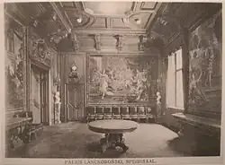 Über dem florentinischen Kamin von Francesco di Simone aus dem 15. Jahrhundert befand sich ein modernes allegorisches Fresko des Wiener Malers Ludwig Mayer. Eine antike Marmorbüste von Kaiser Augustus, eine Tonstatuette Charlotte Wolter als Thusnelda von Tilgner sowie eine italienische Marmorbüste des Niccolò Machiavelli von Cinquecento standen ebenfalls dort. Auf dem Schreibtisch links befand sich die Bronze Sappho von James Pradier, rechts die Bronzekopie Mercur nach Giambologna. Über einem altdeutschen Schrank waren die Porträts des heiligen Stanislaus Kostka als Knabe, Ende des 16. Jahrhunderts der venezianischen Schule und des heiligen Karl Borromäus zu sehen. An der Wand der abgestumpften Ecke das Gemälde St. Franciscus v. Assisi, ein Werk der spanischen Schule aus dem 17. Jahrhundert, daneben eine altitalienische Laute. Darunter auf dem Gesimse Entwurf einer Goethestatue von Rauch, darunter eine japanische Vase. Ansonsten befanden sich Kopien in Öl- und Wasserfarben nach Botticelli, Giambellino, Antonio Pollaiuolo, Andrea del Sarto, Fra Angelico, Raffael, Giorgione, Tizian, Franciabigio, Murillo und anderen. Der Plafond zeigte Porträts aus der Schule des Vittore Carpaccio.