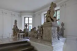 Aus einem anonymen Kupferstich um 1737 kann man entnehmen, dass hinter dem Schloss ein schmaler, langgestreckter Barockgarten lag, dessen Sichtachse von einem Grottenpavillon abgeschlossen wurde, der dem Wallpavillon des Dresdner Zwingers als Vorbild gedient haben soll. In der Mitte des oberen Gartenteiles lag ein Komödienparterre, das mit acht Figuren der Commedia dell’Arte geschmückt war.