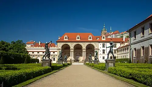 Im Garten des Waldsteinpalais sind Abgüsse der originalen Skulpturen aufgestellt. Zudem befindet sich im Garten die Wallenstein-Reithalle (Valdštejnská jízdárna), die von der Prager Nationalgalerie für Ausstellungen genutzt wird.[2] 2016/17 fand in der Reithalle die Bayerisch-tschechische Landesausstellung statt.[3]