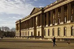 Ludwig XIII. beauftragte Jacques Lemercier mit einem Umbau des vierflügeligen Schlosses, der den Mitteltrakten der Flügel neue Pavillons zufügte. Ludwig XIV. entschloss sich, die Anlage, vor allem im Bereich der Ostseite, umzugestalten. Er beauftragte den italienischen Baumeister Gian Lorenzo Bernini damit, passende Baupläne auszuarbeiten.[5] Berninis Entwurf sah jedoch eine völlige Umgestaltung des Bestandes vor und wurde fallen gelassen, als dieser Paris verlassen hatte. Stattdessen erhielt ein Ausschuss um Louis Le Vau, Charles Le Brun, Claude Perrault – dem der Hauptanteil an dem Entwurf zugeschrieben wird[6] – sowie seinen Bruder Charles Perrault den Auftrag, einen neuen Entwurf für die östliche Hauptfassade zu konzipieren.[7] Dieser wurde schließlich genehmigt und gelangte in der Zeit von 1667 bis 1674 zur Ausführung. Vor allem wegen der damals neuartig freistehenden, rhythmisierten Kolonnaden sorgte die neu errichtete Fassade für helles Aufsehen und wurde zu einem Sinnbild der architekturtheoretischen Querelle des Anciens et des Modernes in Frankreich.[8] Der hier angewandte strenge Stil des klassizistischen Barock sollte für Frankreichs Architektur der folgenden Epochen prägend sein. Ab 1674 wurden die Arbeiten am Louvre vorerst eingestellt. Da Ludwig XIV. seinen Regierungssitz 1682 nach Versailles verlegte, verlor das alte Stadtschloss vorerst seine Bedeutung.