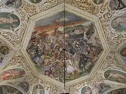Im ersten Stock werden Zyklen aus der griechischen und römischen Geschichte dargestellt: Im Vorzimmer befindet sich von Bernardo Castello ein Gemälde mit der Familie Dareios III. zu Füßen Alexanders des Großen von 1592. Im Salon malte Andrea Semino die Begegnung zwischen Alexander dem Großen mit der Königin der Amazonen. In Räumen des Ostflügels malte Bernardo Castello Szenen mit Antonius, Octavian und Scipio. Die Räume im Westen gestaltete Lazzaro Tavarone, einen Saal mit Szenen zu Cäsar und einen mit Szenen zu Pompejus.