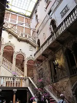 Die Innenräume, die in neugotischem Stil renoviert wurden, zeigen zahlreiche Anklänge an das Mittelalter. Zentrales Element des Hauses ist der große Innenhof, den eine goldene Treppe und mit maurischen Bögen und kleinen, orientalischen Säulen verzierte Galerien dominieren. Diese Restaurierung ist ein Beispiel für Faszination internationaler Touristen durch das dekadente Antlitz Venedigs.[2] In den Räumen finden sich Kunstwerke, antike Möbel und Lampen aus Murano.