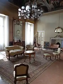 Der Maler Domenico Fiasella erhielt kurz nach 1623 den Auftrag, die Innenräume auszuschmücken, was später Giovanni Carlone und sein jüngerer Bruder Giovanni Battista Carlone fortsetzten. Die ausgeführten Szenen erzählen die Geschichte der biblischen Heldin Ester, die mit Zähigkeit und Mut ihr Volk befreite – was als Parallele zum Sieg des Dogen Giacomo Lomellini über Herzog Karl Emanuel I. von Savoyen gelesen werden konnte.[8] Der Freskenzyklus entfaltet sich in einer Reihe von Räumen: im Gewölbe des Atriums beginnt er mit dem Fall Jerusalems, setzt sich im Piano nobile mit dem Bankett des Ahasverus fort und im zweiten Stock mit der Wahl Esthers durch Ahasverus.