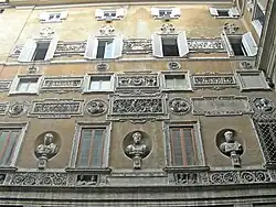 Maderno war unter anderem für die Gestaltung der straßenseitigen Fassade des Palastes, des Innenhofes mit seinen Loggien und die altana, die Dachloggia, des Palazzo verantwortlich. Die Fassade zur Straße hin ist in Ziegelmauerwerk und Travertin ausgeführt, die Kanten des Gebäudes zeigen Bossenwerk. Das Gesims ist mit den Familienwappen verziert, den Adlern der Gonzaga und dem Schachbrettmuster der Familie Mattei.