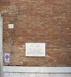 „Hier lebte Senator Luigi Albertini (1871–1941). Er schuf den Corriere della Sera, aus dem er 1925 vom Faschismus verdrängt wurde. Er schrieb über das politische italienische Leben und gründete die Wein-Kulturen von Torre in Pietra.“