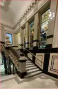 Die prächtige Treppe, die zum Direktionsgeschoss führt, ist mit Glasfenstern verziert, die Italien und die von ihm „erlösten“ Länder darstellen: Auf dem linken Treppenzug in der Mitte ist Italia turrita dargestellt, flankiert von den Darstellungen des Friaul und des Trentino; der rechte Treppenzug zeigt in der Mitte vorne Italien, die Stadt Triest mit ihrem Symbol – ein altes, französisches Schild in roter Farbe mit versilberter Hellebarde -, flankiert von Istrien und Dalmatien. Der symbolische Wert der dargestellten Elemente gewinnt an Bedeutung.